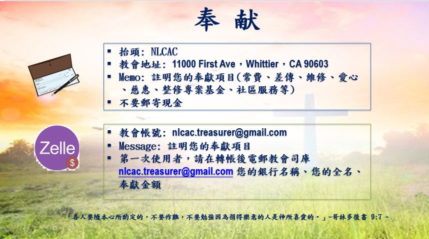 首页2 非常歡迎您蒞臨基督教新生命宣道會中文堂網頁 2026年度主題:【往下扎根,向上結果】 我們在教堂實體主日崇拜,並有同步網絡直播,詢問訊息,請電郵或電話聯繫我們 地址:11000 First Avenue, Whittier, CA 90603 地圖電話:(562) 282-9360郵址:info.ch@nlcac.org;聯繫我們;奉獻訊息 聚會時間:主日崇拜:11am – 12:30pm(中文); 9:30 – 11am(英文)主日崇拜,主日學,禱告會,小組團契 我們的信仰、願景和使命 主日崇拜與講道信息 主日學教材及課程表 小組團契聚會時間及活動 一對一門徒訓練 教會消息與活動剪影 新生命家訊文章與月刊 社區服務及延展事工 十架之路四十天 – 復活節讀經靈修 靈修專題 – 信仰與生活 靈修專題 – 標竿人生