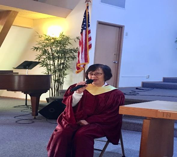 剛聽了宋永琴妹妹的見證,她來我們教會已經 四十年,而我才來正好一年,我是去年的感恩節 來到這個教會。我和先生去年從Cerritos搬到La Mirada, 因為我們夫婦身體都不很好,我先生患 有帕金森症,而我有腰椎毛病,曾經作過手 術,不能站太 久,如站太久 就會腳痛。感 謝 神帶領來 到這個教會, 以前我們在國 語浸信會會但離家太遠,很不方便。我還沒來此 教會之前,有一次到Senior Center吃午餐時碰到 Carol Chen姊妹,她就介紹我過來,我覺得這個 教會很不錯,離家很近,只要7分鐘車程,甚至走 路也可到,所以我就過來看看, 以前去的教會總 是感覺不舒服,但我來到這個教會卻感覺很舒適 也很滿意。上星期我帶了二位從香港來看我的姊 姊來教會參加崇拜聚會,他們回家後都稱讚説: 你們的禮拜堂非常舒適,不僅地方寛敞舒服,牧 師的講道也很好。我們原來屬於浸信會,裏面情 形和我們教會差不多,雖然我們身體情況不佳, 還讓我們去唱詩班服事,希望天父賜給我們恩賜 來事奉祂。我也期望能和宋姊妹一樣幾十年都留 在這個教會不離開。我也非常謝謝大家對我的愛 護,當我不在,或出外旅遊時,他們都會關心我 去那裏,還為我的平安禱告,真的感謝弟兄姊妹 們的關懷。還有我也請大家為我們詩班禱告,我 來這個詩班就覺得有缺少一個司琴的問題,在下 午練習時沒有司琴,就覺得訓練不夠,希望能找 到一個司琴,我們的獻詩就會變得更好。(2018 感恩見證)