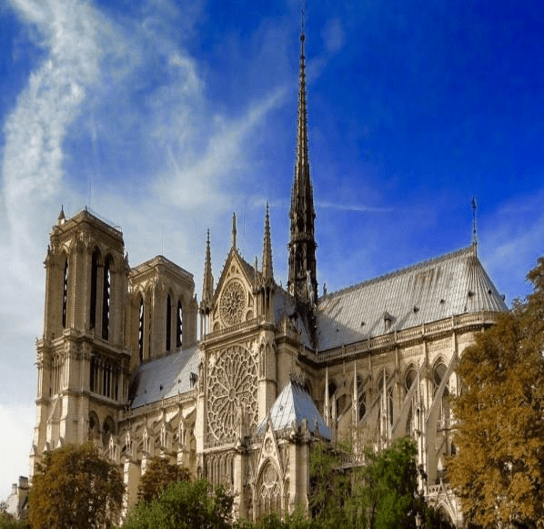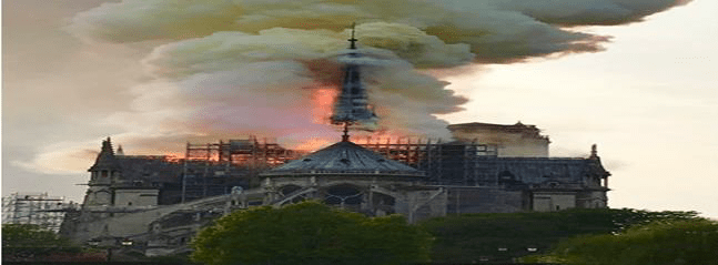 在今年法國當地時間4月15日,驚傳有850年歴 史,舉世聞名的巴黎聖母院(Nortre Dame de Paris)發生重大火災,遭遇強烈火焰吞噬,造成 頂尖塔與部分建築主體倒塌,屋頂及部分建築 毀損。大批法國民眾及各地來的觀光客親睹法 國象徵的教堂陷入火海,紛紛為之悲傷,有人 痛苦流涕,有人下跪禱告祈福,呈現一片哀 戚。這座具有法國宗教、文化和歷史象徵的建 築物,世界人類文化瑰寶慘遭大火浩劫,引起 全球民眾的震撼和心碎。大火經過撲滅,所幸 石頭拱頂基本保持完整,更慶幸的耶穌在受難 十字架上頭戴的荊棘冠、大玫瑰花窗、鐘樓、 管風琴及大部分珍貴文物都奇蹟被保住。
