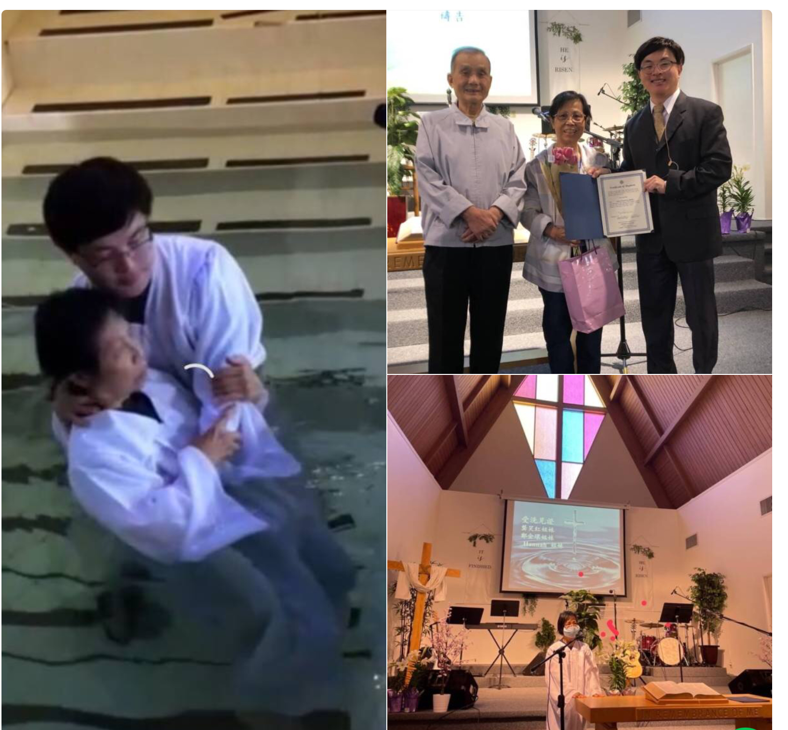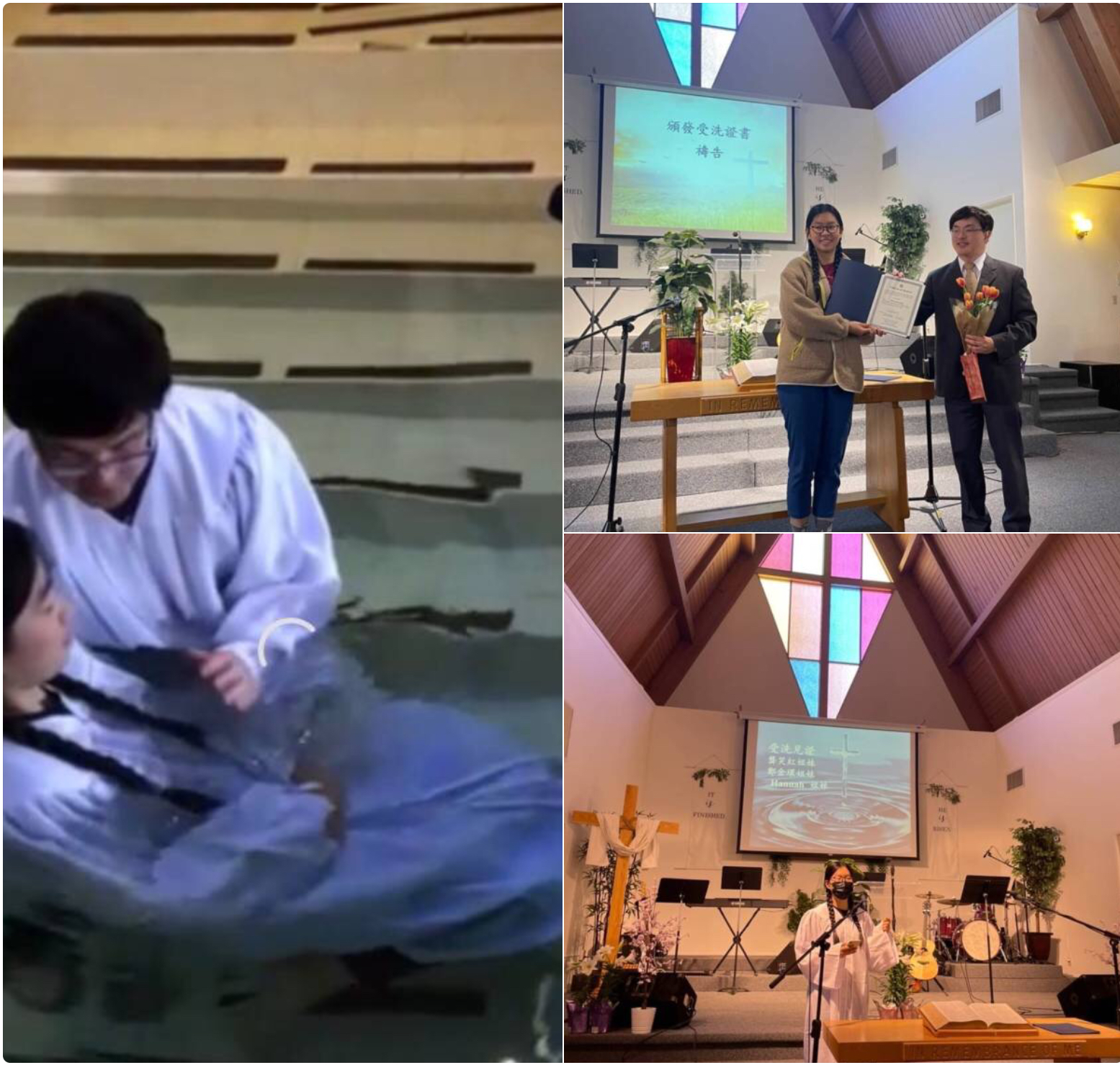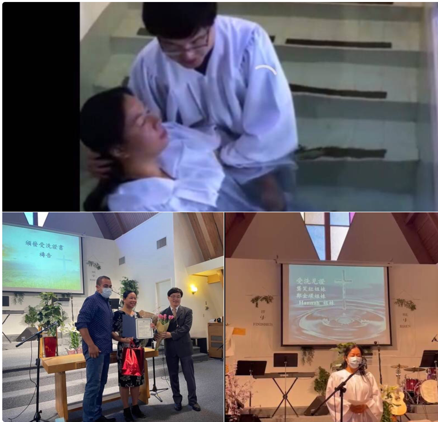 復活節受洗見証:今天英文堂有 Ethan Kong 弟兄, 中文堂有龔 笑紅、鄭金環(Kimberly) 、Hannah 等三位姊妹受洗歸 入基督,並自動成為本教會會友。