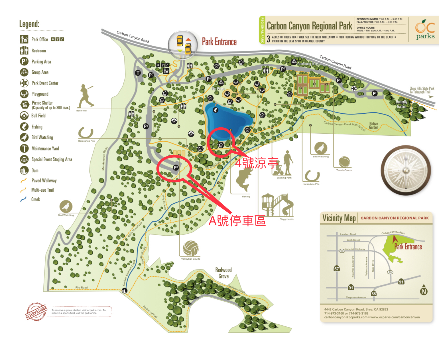 - 地點:4442 Carbon Canyon Road,Brea, CA 92823, Tel: (714) 973-3160。點擊此行或公園圖片以獲得抵達公園的Google行駛地圖