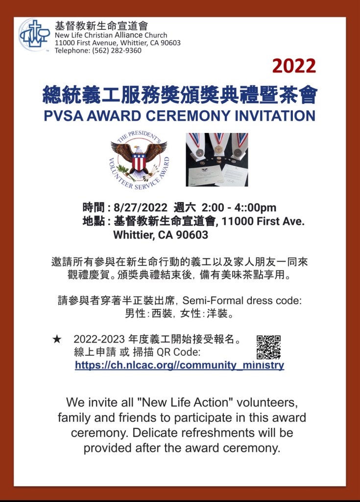 【新生命行動義工】頒獎典禮:八月二十七日,星期六,下午2:00-4:00,將在教會舉辦【新生命行動義工】頒獎典禮, 參與人數估計有120-200人。需要人手幫忙茶點、布置和接待,如有自願者請與負責人王美英姐妹和羅玲玲姐妹聯絡。