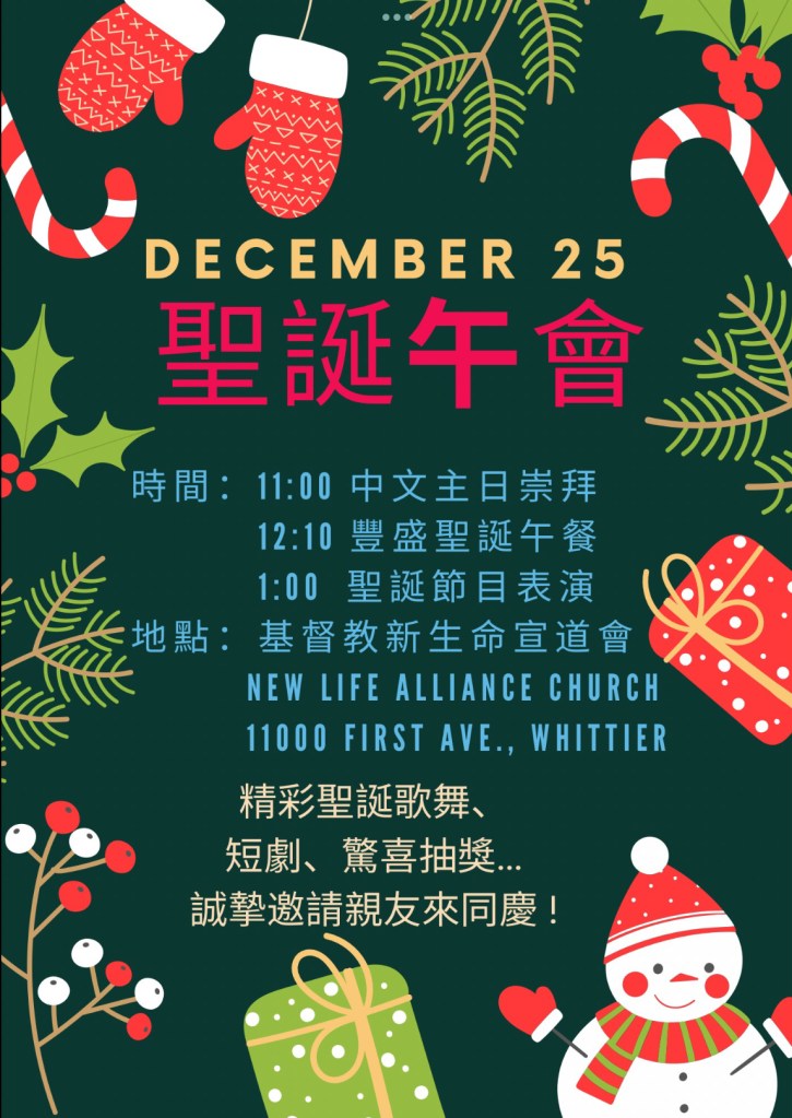 聖誕[午]會:12/25聖誕主日午餐後,1:30-2:30 pm,在大堂舉行,歡迎邀請親朋好友參加。請每一團契小組提供一項節目,若時間許可,也歡迎個人才藝報名。報名聯絡人:羅玲玲和黃滬珠姐妹。