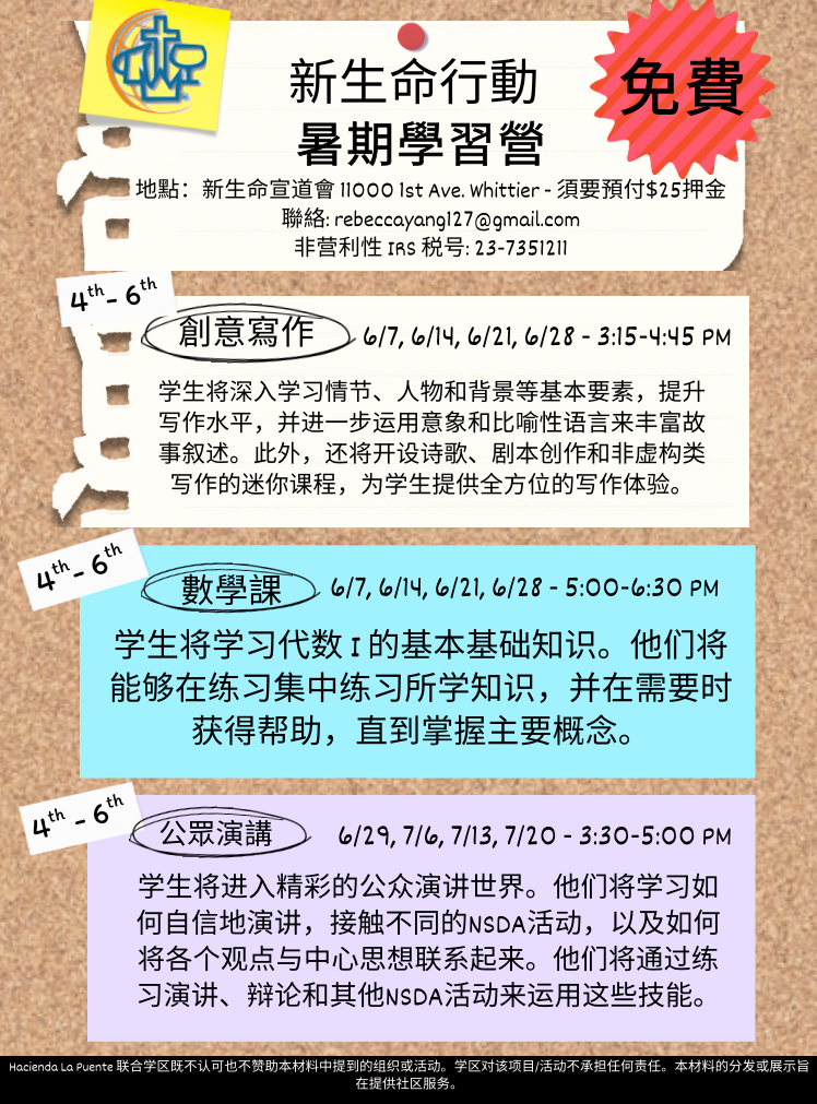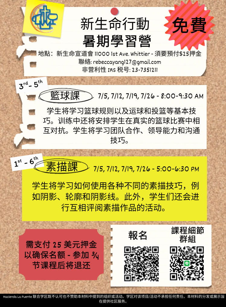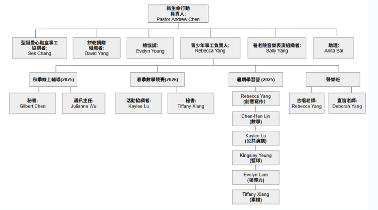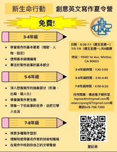 - 上課時間:每月的第四個主日1:00-2:00 pm 歡迎所有想參與新生命義工活動並學習基礎音樂的孩子們來報名參加! 聯絡人:廖勉 姊妹 626-758-7280