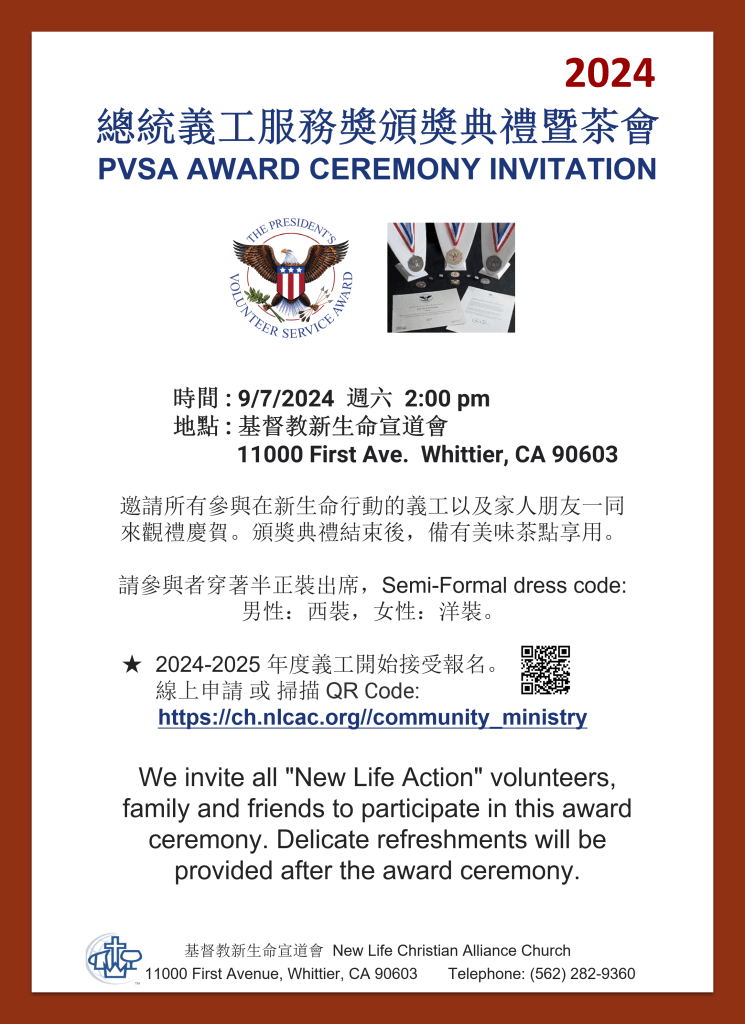 基督教新生命宣道會也是美國總統義工服務獎(PVSA)的授證機構之一,如符合條件,我們可以為您提出申請,也會為得獎者舉行頒贈儀式。