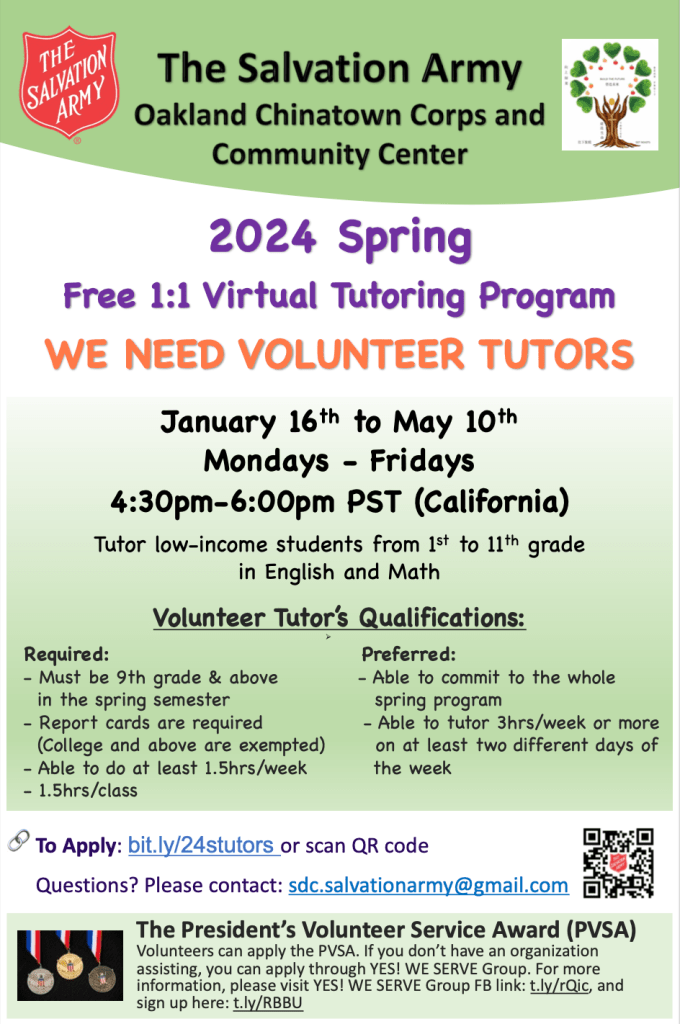- 救世軍網路輔導教學 Salvation Army 1:1 Tutoring Program:這個項目是幫助低收入家庭的孩子學習英語及數學。巳填寫新生命行動義工申請表者,可直接點擊按鈕申請。